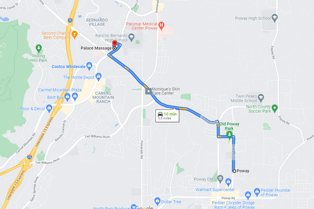From Poway, California, to Palace Massage, 12125 Alta Carmel Ct #380, San Diego, CA 92128
