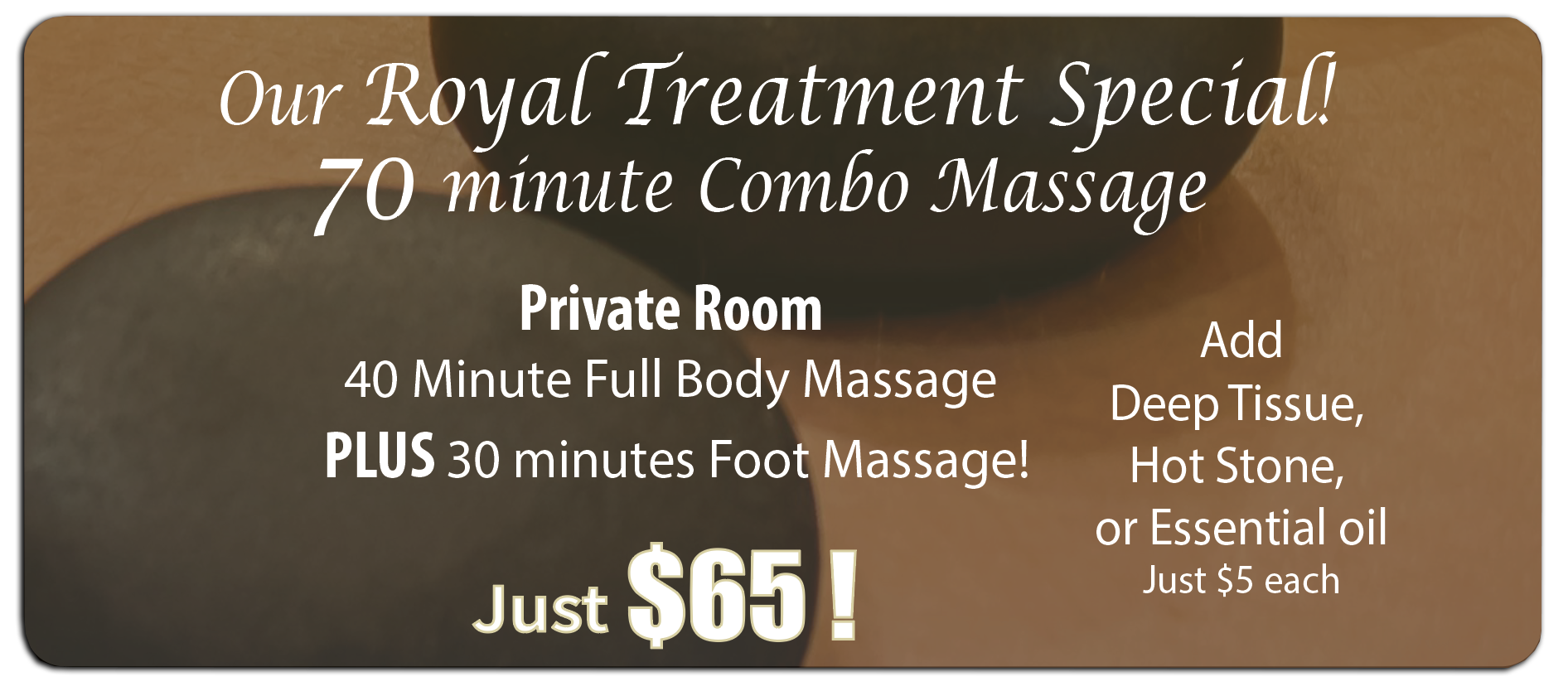 | 90 Minute (Private Room, 45 min. Body, 45 Min Foot & Legs) | $80 |